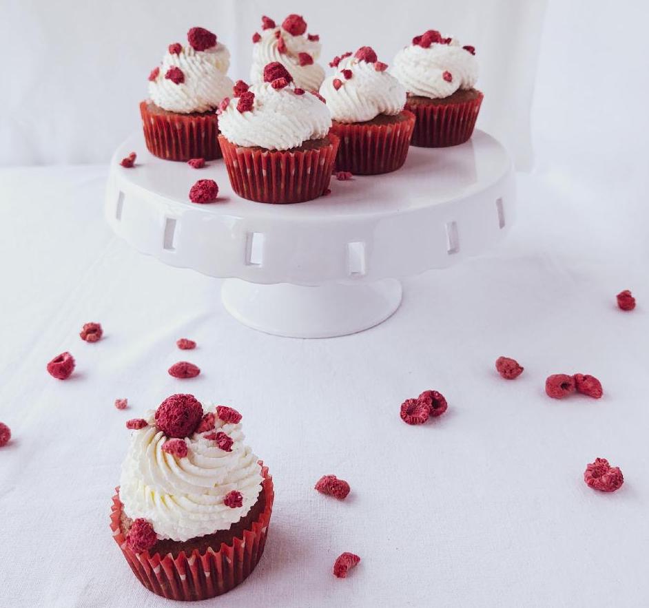 Smícháme suché suroviny, přidáme tekuté a krátce, ale důkladně promícháme. Připravíme si papírové košíčky, které plníme do 3/4. Pečeme ve vyhřáté troubě na 180 st. Celsia 10 minut a dopečeme na 170 st. Celsia 15 minut. Zkontrolujeme špejlí, zda je upečeno. Vychladlé košíčky nazdobíme vyšlehanou šlehačkou o tučnosti 33% a posypeme lyofilizovanými malinami.