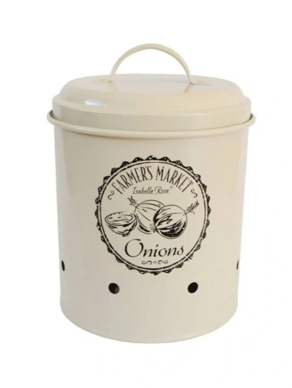Stylová kovová dóza na cibuliod značky Isabelle Rose v teplém béžovém odstínu s jemným retro nápisem je ideální kombinací funkčnosti a vintage estetiky. Díky malým větracím otvorům zůstávají vaše cibule déle čerstvé a připravené k použití, a nádoba zároveň působí dekorativně na jakékoli kuchyňské lince. Design inspirovaný provensálským stylem přináší nádech francouzské venkovské elegance, zatímco praktické rozmístění otvorů zajišťuje optimální cirkulaci vzduchu a prodlužuje trvanlivost potravin. Robustní kovové tělo s matným béžovým povrchem dodá vaší kuchyni šmrnc a útulnost.