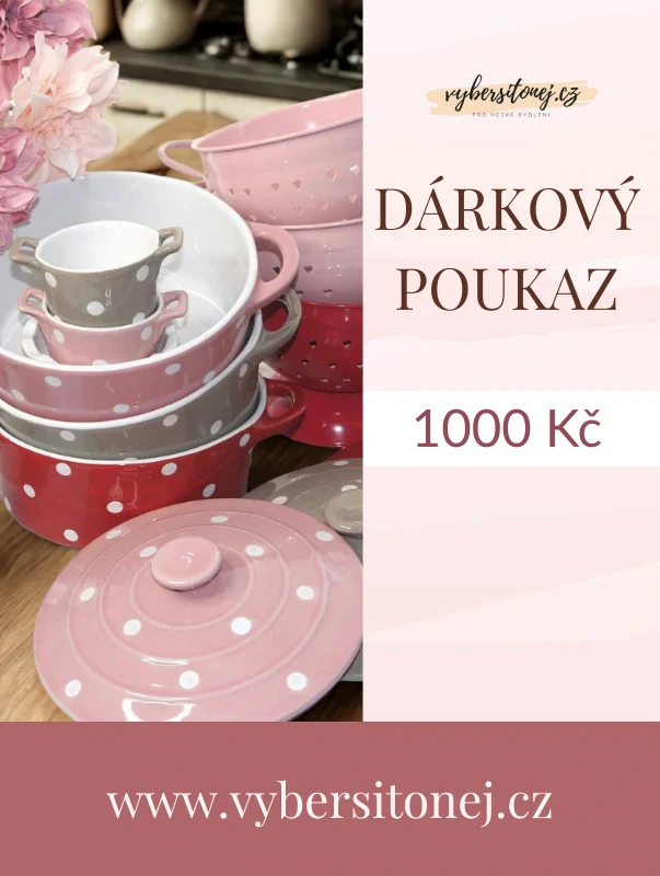 🎁 Darujte svým blízkým radost z výběru stylových doplňků do domácnosti – s tímto dárkovým poukazem Vybersitonej.cz v hodnotě 1000 Kč. Příjemkyně si mohou vybrat z pestré nabídky kuchyňských doplňků, porcelánu, dekorací a textilu.