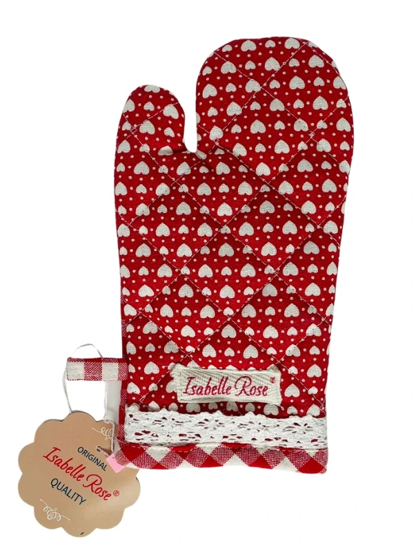 Vaření může být zábava i pro ty nejmenší! Roztomilá dětská chňapka Love od značky Isabelle Rose v červené barvě se srdíčky je ideální pro malé pomocníky v kuchyni. Nejenže skvěle vypadá, ale díky bavlněnému materiálu a výplni poskytne i základní ochranu při vaření či pečení s rodiči. Chňapka má ideální velikost pro dětské ruce, poutko pro zavěšení a stylový design, který ladí s dalšími produkty z kolekce Love – třeba se zástěrou, utěrkou nebo dospěláckou verzí chňapky.