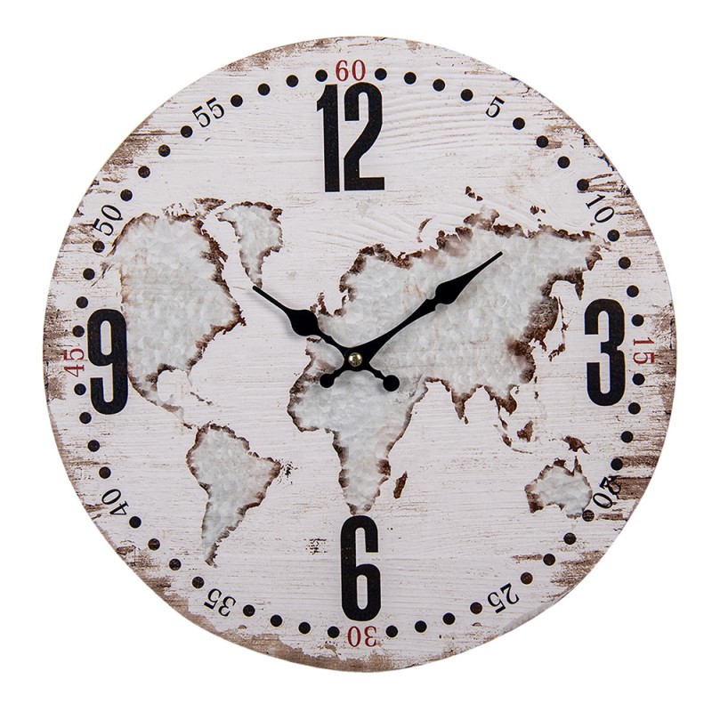Vneste do svého domova jemný cestovatelský nádech s těmito stylovými nástěnnými hodinami od Clayre & Eef. Vyrobené z MDF desky o průměru 34 cm s vintage mapovým motivem, snadno se hodí do obýváku, pracovny i kuchyně. Designový světový motiv v přírodních tónech a přehledné římské číslice potěší ženy, které si cení krásu i funkčnost v každodenním životě. Jednoduché uchycení na zeď a napájení single AA baterií (není součástí balení) doplňuje praktický dojem