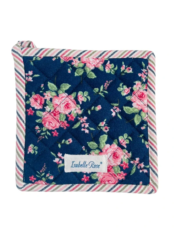 Tmavě modrá bavlněná podložka či chňapka „Bella Blue“, zdobená jemnými růžovými růžičkami, je nejen praktickým kuchyňským doplňkem, ale i stylovým retro prvkem každé domácnosti. Vychází z populární kolekce Bella znamenité značky Isabelle Rose a svým elegantním motivem vnese do vaší kuchyně nádech francouzského vintage. Chňapka je vyrobena ze 100 % přírodního bavlněného textilu, ideálně ochrání vaše ruce i pracovní plochy před vysokou teplotou a zároveň je příjemná na dotek.