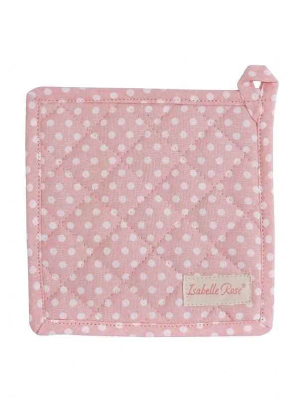 Kombinace praktičnosti a nostalgie v kuchyni — tato textilní podložka nebo chňapka v pastelově růžové barvě ozdobená bílými puntíky patří do kolekce růžová s puntíky od Isabelle Rose. Vyrobena z 100 % bavlny, ideálně ochrání kuchyňské povrchy a ruce před teplem z hrnců a plechů. Kompaktní rozměr 20 × 20 cm se hodí pro každodenní použití nebo jako stylový dárek.