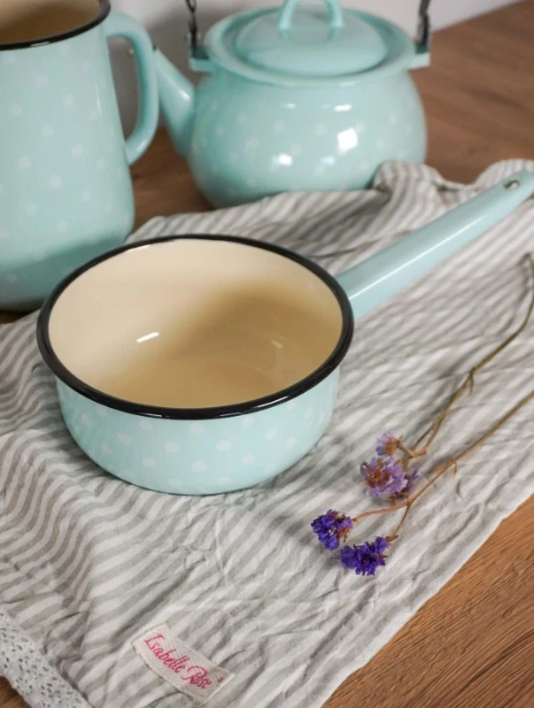 Vytvořte si domácí atmosféru plnou retro elegance díky této smaltované pánvi Isabelle Rose. S veselým modrým puntíkovaným designem přinese do vaší kuchyně šarm starých časů. Ať už připravujete omáčky, polévky nebo ohříváte jídlo, objem 1,5 l je ideální pro každodenní použití i rodinné večeře. Pánev je ručně vyráběná na evropském venkově, kde tradiční technologie zaručují dlouhou životnost. Praktický smaltovaný povrch se snadno čistí a díky svému vintage vzhledu krásně doplní stylový interiér.