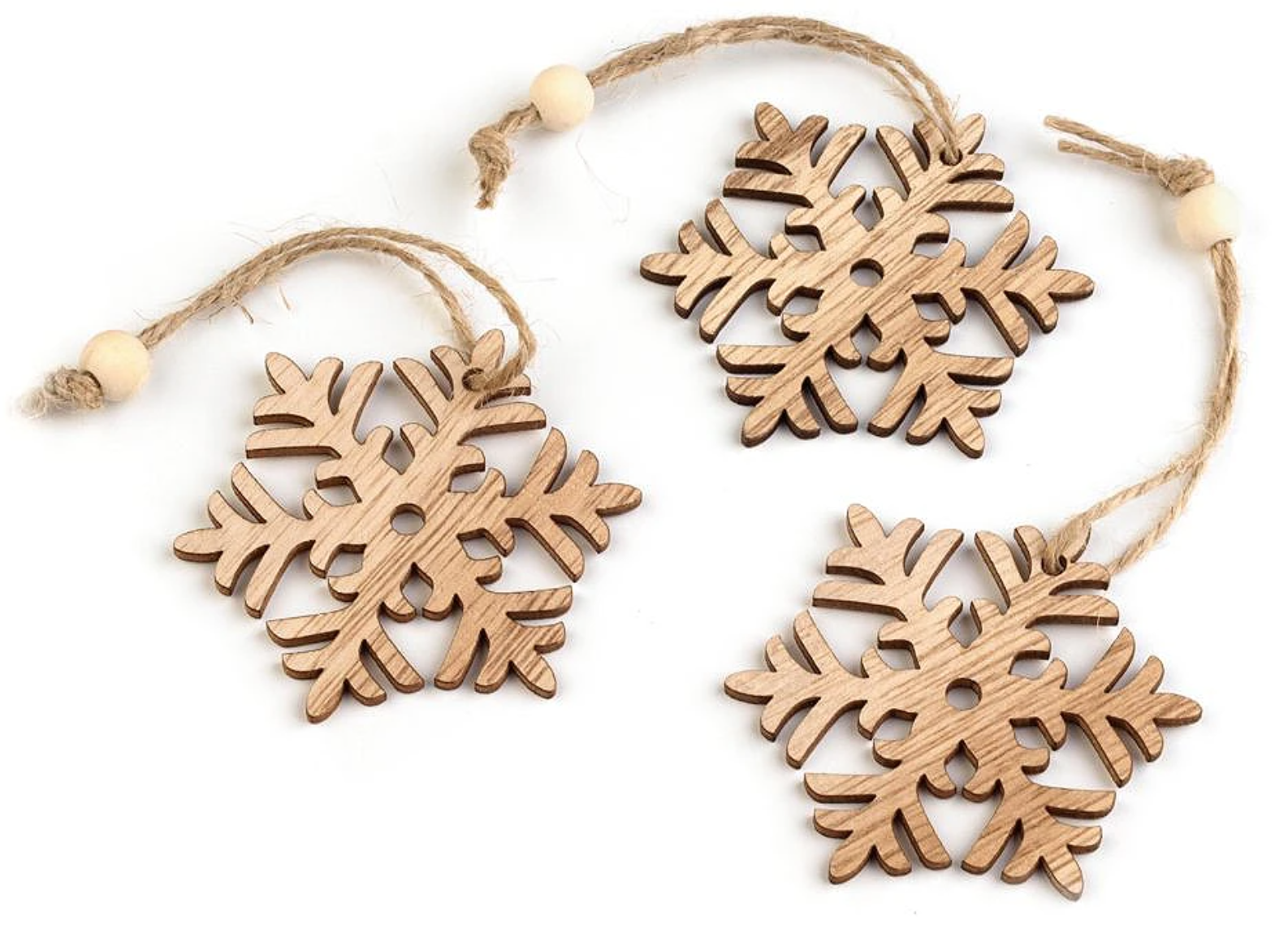 Dřevěné vánoční dekorace mají přírodní dřevěný povrch s krásnou přirozenou strukturou. Díky připevněnému poutku z juty a korálků je můžete pověsit na stromek, na dveře, do oken nebo volně do prostoru. Budou se vyjímat i jako ozdoba na slavnostně zabaleném dárku.