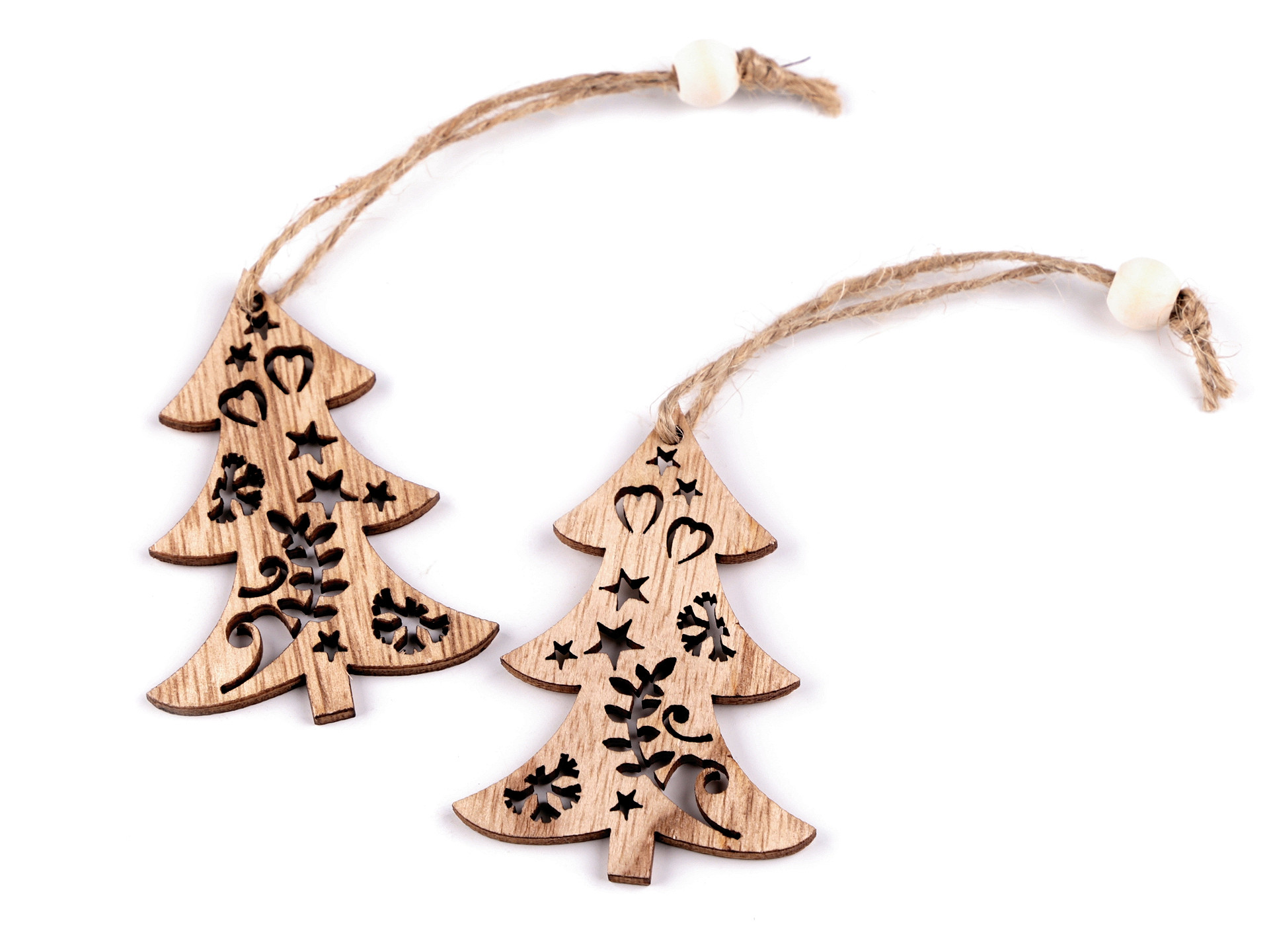 Dřevěné vánoční dekorace mají v sobě ozdobné výřezy. Díky připevněnému poutku z juty a korálku je můžete pověsit na stromek, na dveře, do oken nebo volně do prostoru. Budou se vyjímat i jako ozdoba na slavnostně zabaleném dárku.